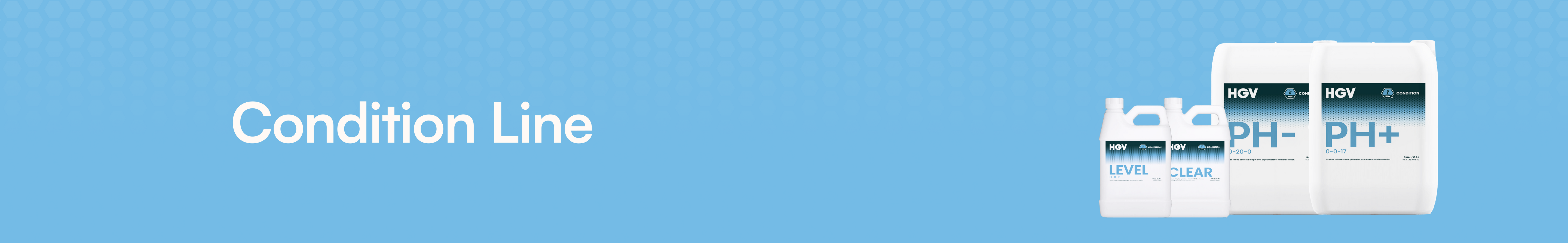 The HGV Condition Line includes four products: pH Up and pH Down for precise pH control, HGV Level to stabilize pH, strengthen plants, and improve stress resistance, and HGV Clear to maintain clean irrigation systems and healthy root zones. All are optimized for compatibility with HGV to ensure consistent performance and maximum nutrient uptake.