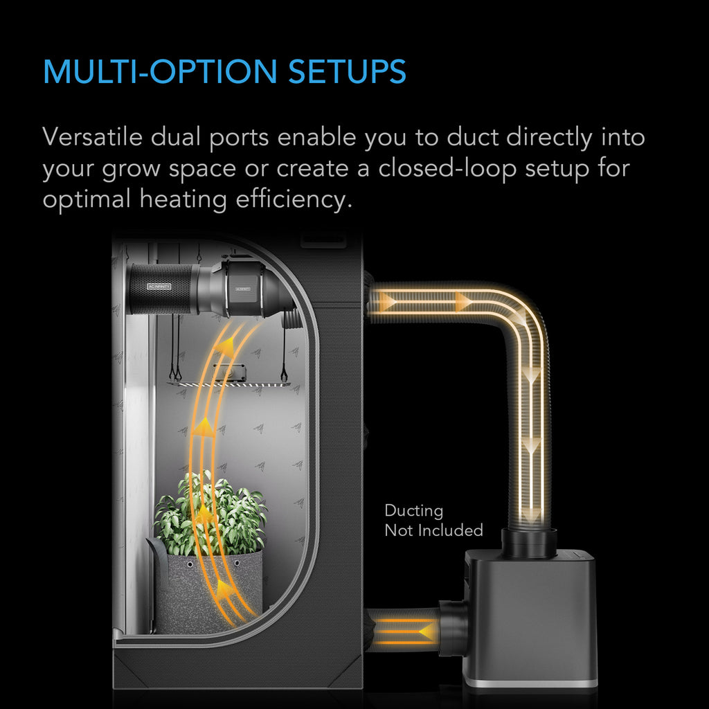 - Dual ports enable you to duct directly into your grow space or create a closed-loop setup for optimal heating efficiency (ducting not included).