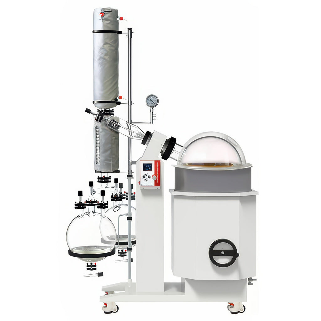 Standard Glassware Set includes 13.2 gallon (50 liters) round-bottomed evaporating flask, 5.28 gallon (20 liters) round-bottomed receiving flask, and vertical condenser. Rotary evaporators with vertical glass condenser are great for distillation of solvents with higher boiling points.