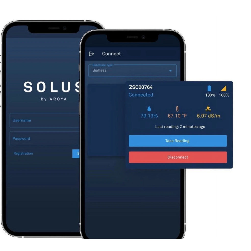 The AROYA SOLUS Sensor Kit combines the industry's top soil sensor with a wireless analysis powerhouse. Together with the free SOLUS by AROYA app, they enable high-precision water content, temperature and electrical conductivity spot checks. The information SOLUS gathers helps growers maximize their substrate and unlock maximum yield potential.