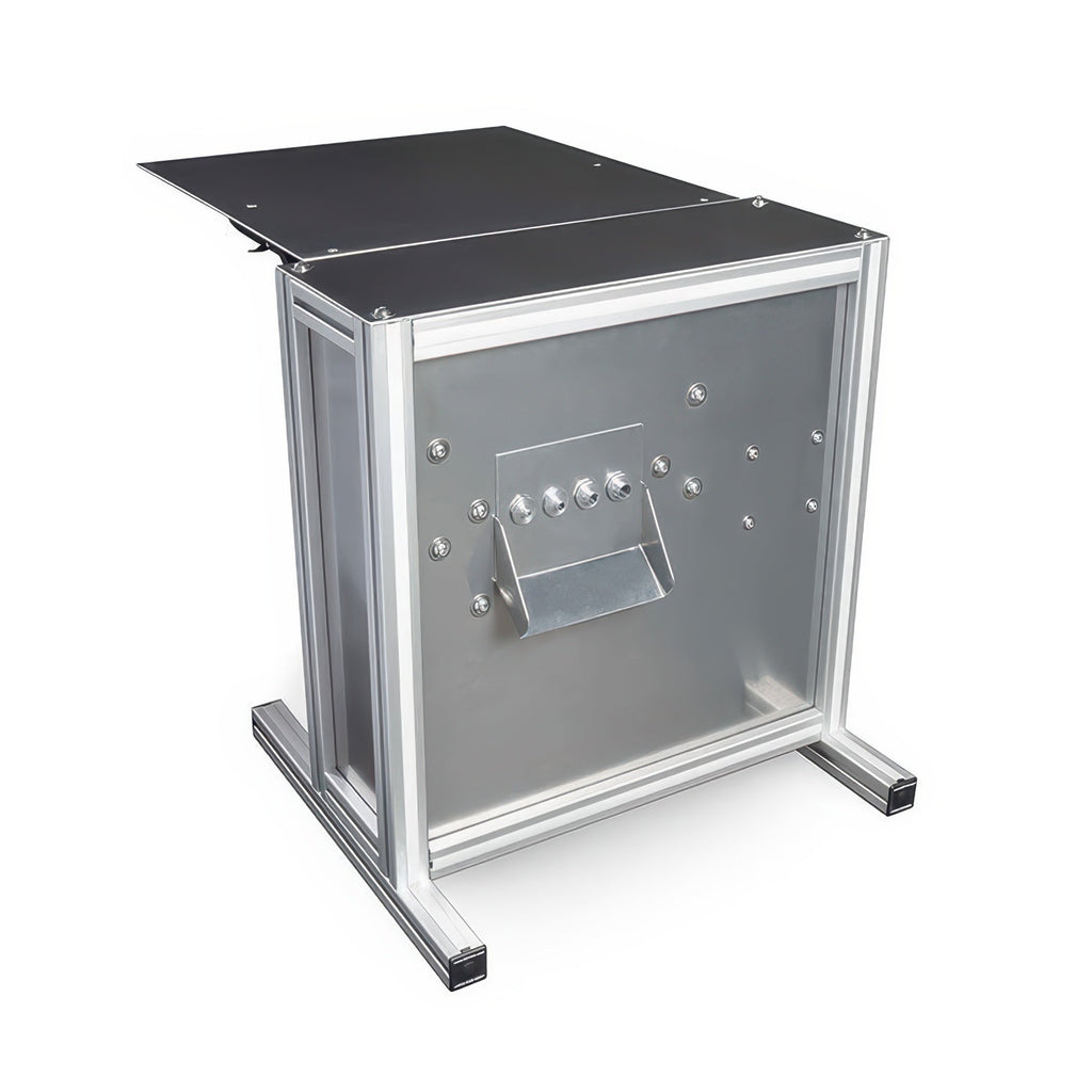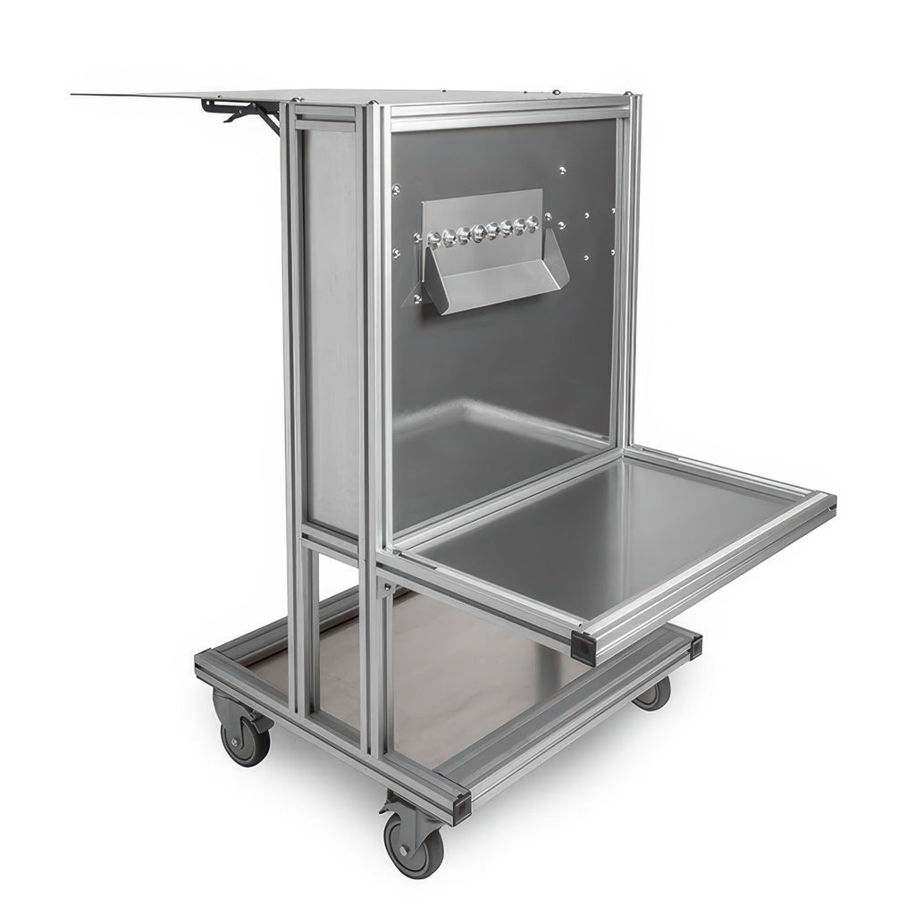 The Bud Bucker comes with a front table to catch the buds, a rear table to catch the stems, and a top prep table to use as a work surface.