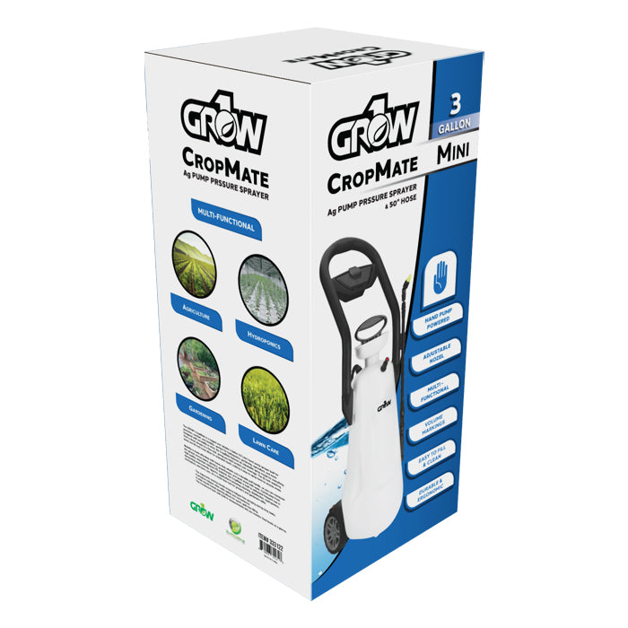 The GROW1 CropMate is a rugged and reliable 3 Gallon (12 Liter) hand pump sprayer built for precision, comfort, and mobility—perfect for hydroponics, gardening, agriculture, and more. Designed with versatility in mind, the CropMate features an adjustable spray nozzle for everything from a direct stream to a fine mist, giving you total control over coverage. The 22-inch watering lance and 50-inch hose allow for extended reach, making it easy to spray hard-to-access areas.