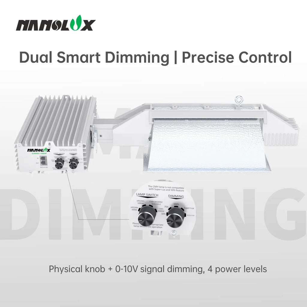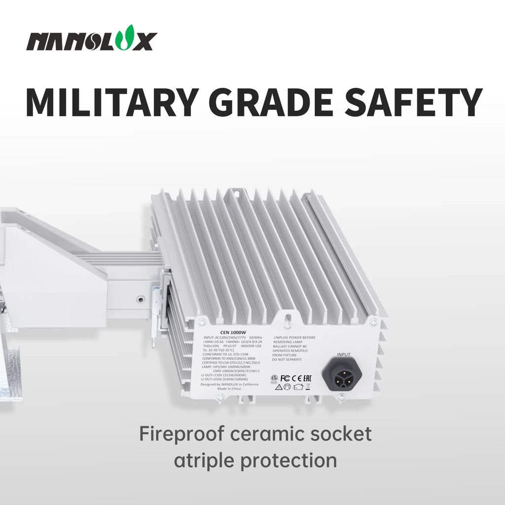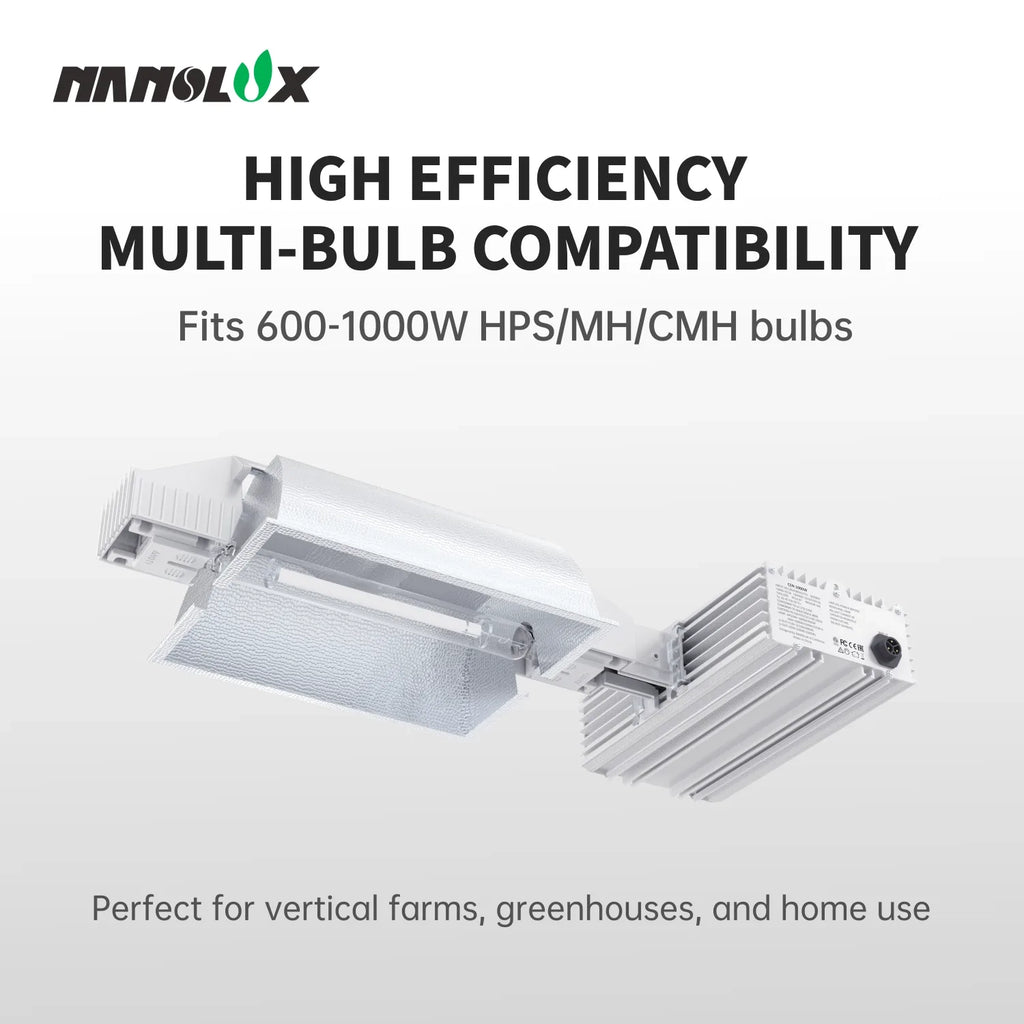 Compatible with 600–1000W HPS, MH, and CMH bulbs, both SE and DE.