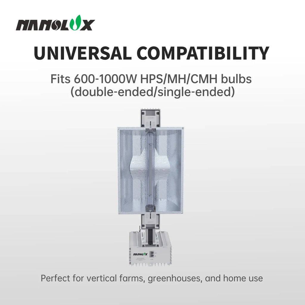 Compatible with 600–1000W HPS, MH, and CMH bulbs, both SE and DE.
